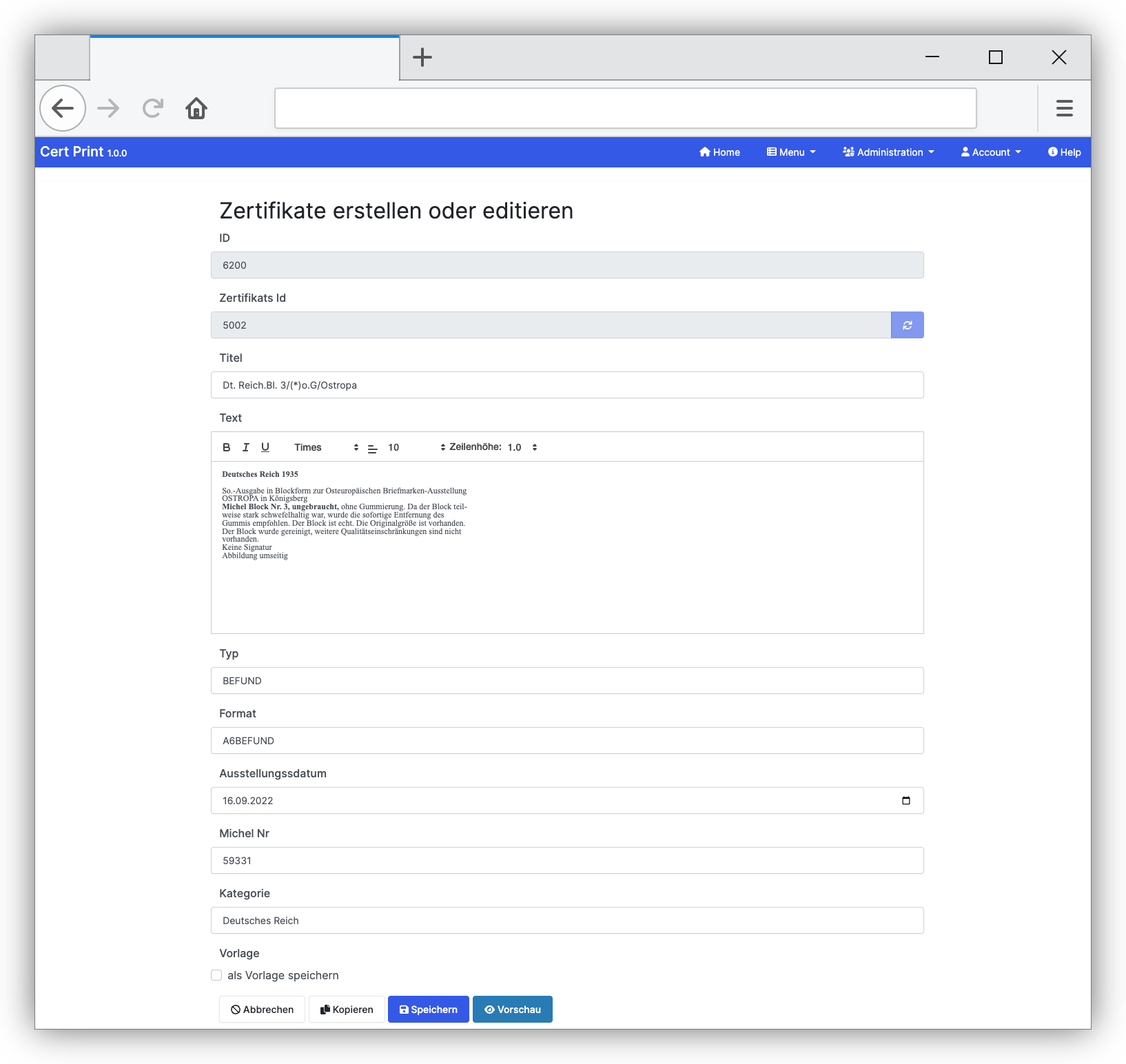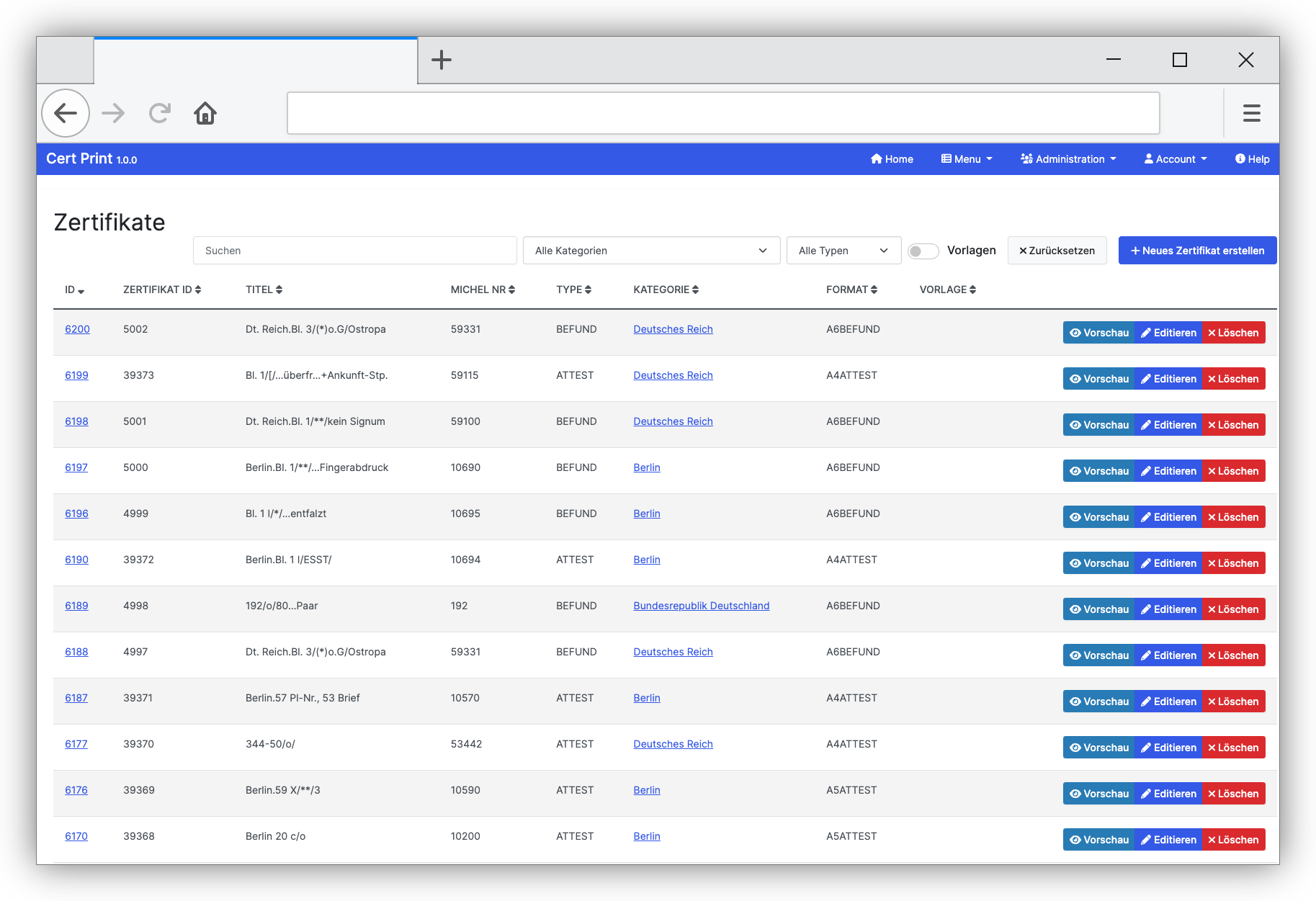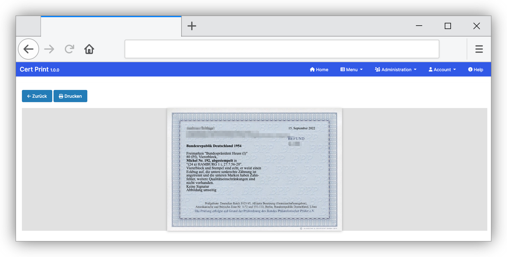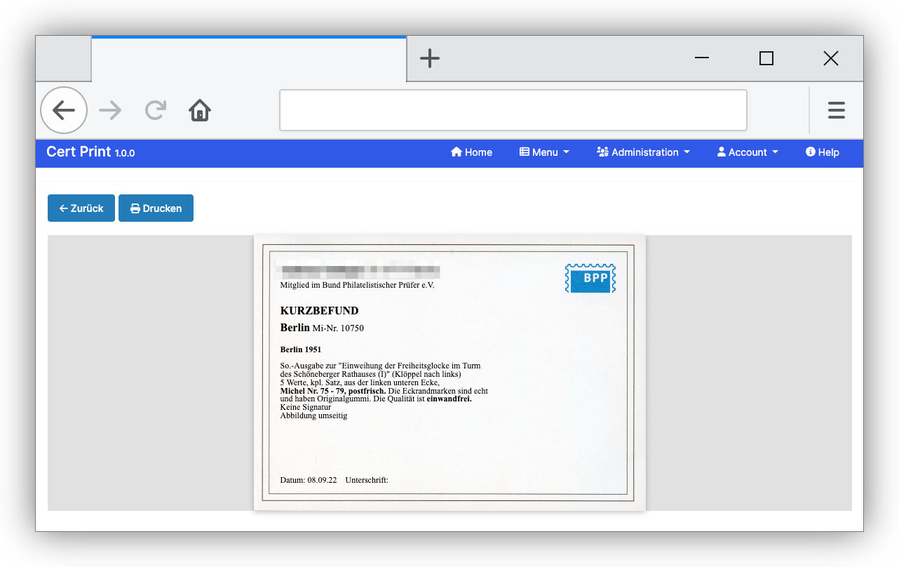 Einfache Erstellung, Verwaltung und Druck von Zertifikaten des Bund Philatelistischer Prüfer. Auf Anfrage können auch weitere Zertifikate unterstützt werden. Schreiben Sie mir einfach eine email bei Fragen oder um ein Angebot zu erhalten.